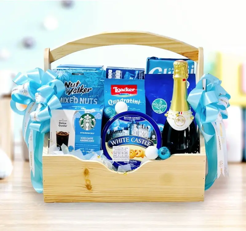 กระเช้าของขวัญ กระเช้าปีใหม่ 2568 ในตรีมสีน้ำเงิน สีฟ้า